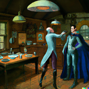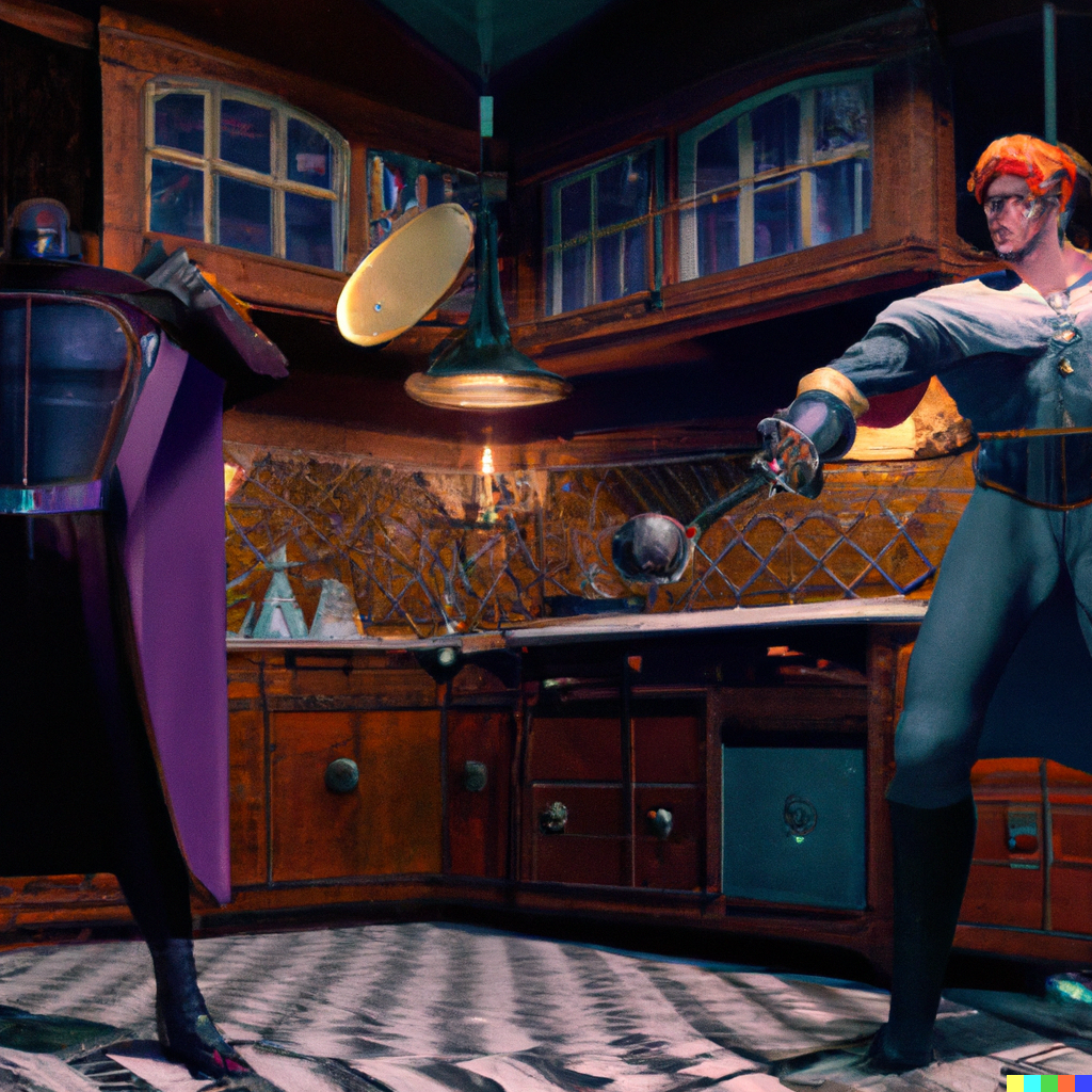 DALL·E 2022-09-15 20.42.26 - a futuristic space hero fighting a dark caped villain in a historic victorian kitchen.png